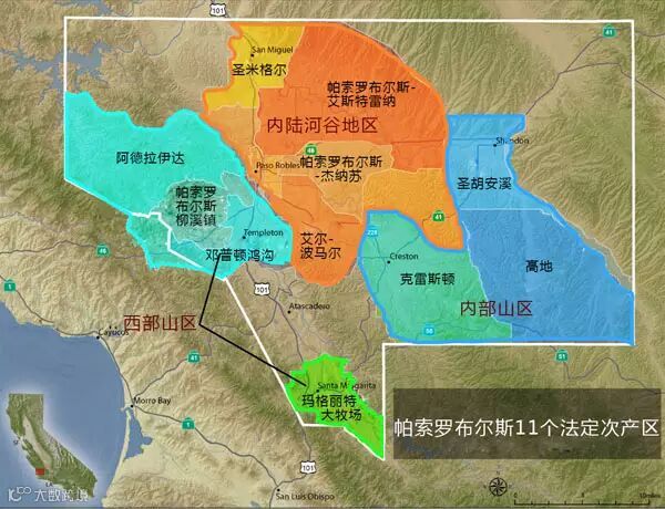 帕索罗布尔斯产区西边的位置位于桑塔露琪亚山脉,这里分布的次产区有阿德拉伊达(Adelaida)、帕索罗布尔斯柳溪镇(Paso Robles Willow Creek)和邓普顿鸿沟(Templeton Gap)。这些地区海拔高达 730 米,年均降雨量约 760 毫米,土壤以石灰石为主。而该产区最南的次产区要属桑塔玛格丽特大牧场(Santa Margarita Ranch),这里的葡萄种植在海拔高达 426 米的陡峭山坡上,土壤以河流冲积土为主。这些次产区多种植罗讷河谷葡萄品种,很有潜力。