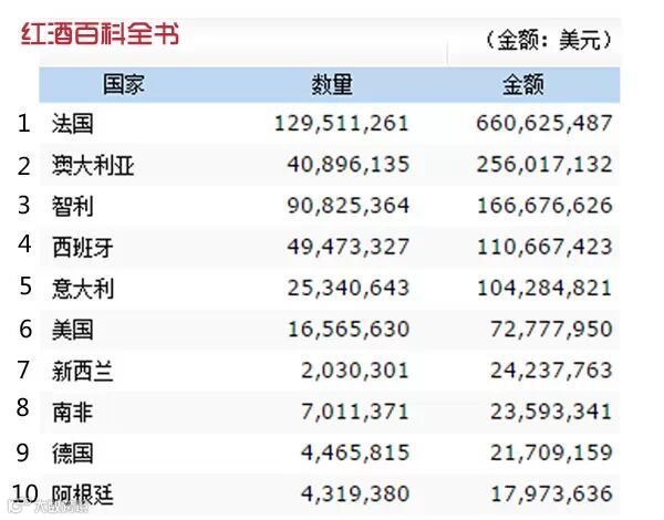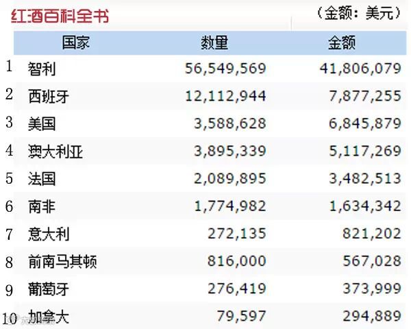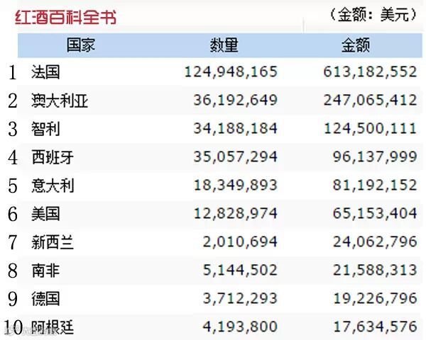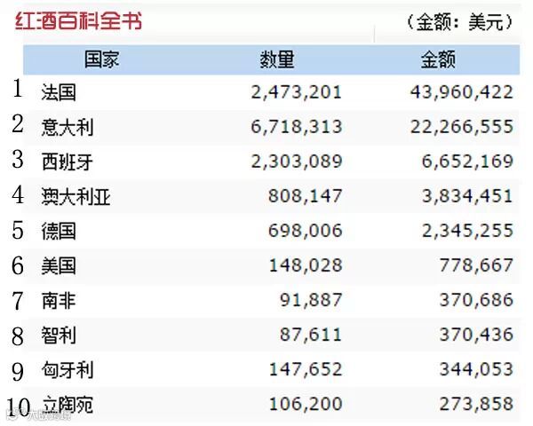 法国依旧是进口瓶装葡萄酒的最大输出国,总量为1.25亿升,约占瓶装葡萄酒总量的43%,总额为6.13亿美元,约占瓶装葡萄酒总额的45%。