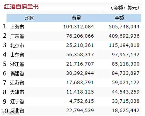 上海依旧是全国进口葡萄酒最多的地区,进口量为1.04亿升,约占总进口量的27.05%,进口总额为5.06亿美元,约占总进口金额的1/3。广东省次之,北京从去年的第4位越至第3位。