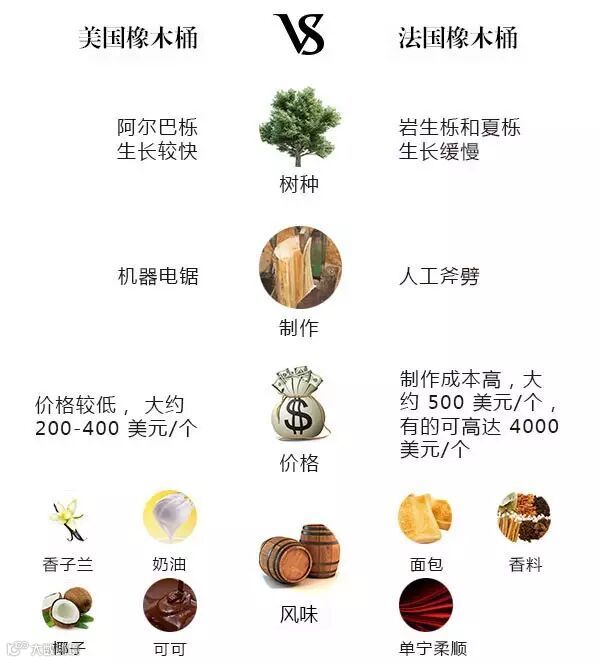 在葡萄酒酿造过程中不管是使用美国橡木桶还是法国橡木桶,都可以增加葡萄酒的香气、风味和单宁,并且提高葡萄酒的复杂度。不过由于橡木种类的不同和气候环境等差异,美国橡木桶与法国橡木桶对葡萄酒的影响各不相同,其主要区别如下图: