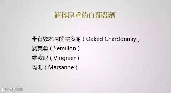 当把酒体厚重的白葡萄酒置于黑色玻璃瓶中,很多人容易把它当作红葡萄酒。这是因为在酿酒过程中,酒体厚重的白葡萄酒与红葡萄酒的酿造工艺大致相同,如在橡木桶中陈年,带有典型的香草和可可的香气,采用苹果酸乳酸发酵等。一些酒体丰满的白葡萄酒通常可以陈年 10 年左右,大部分也在 3 至 4 年。