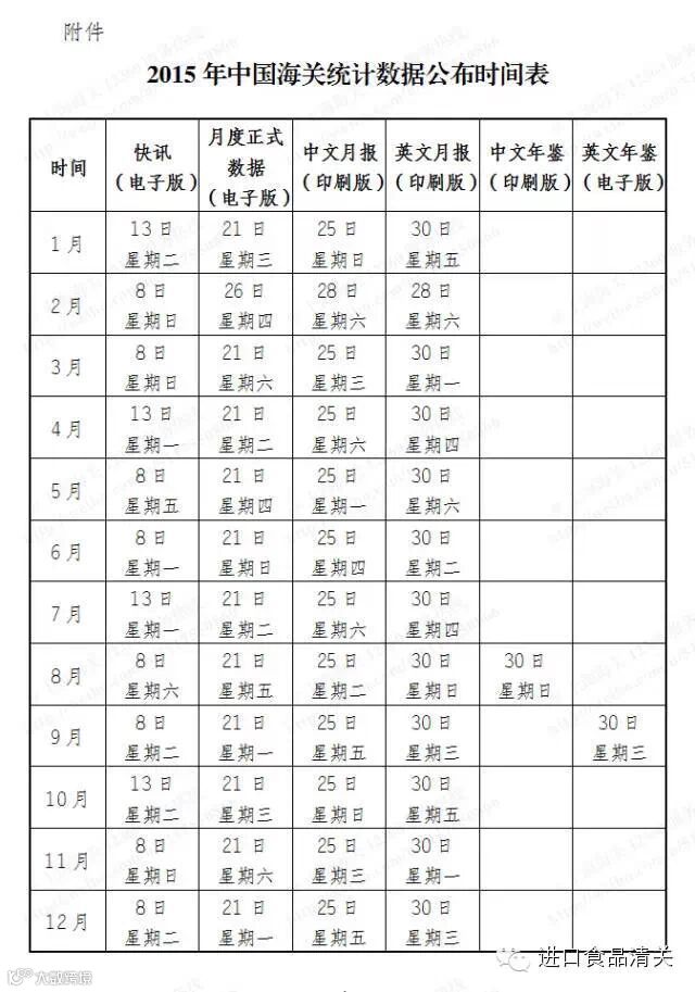 附件:2015年中国海关统计数据公布时间表.doc