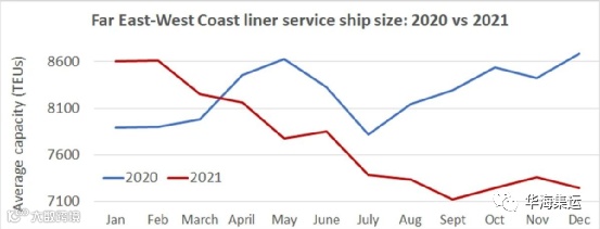 一些运营商通过在二手市场购买船舶或在租船市场租赁船舶,增加了跨太平洋航线的运力。2021年可供购买或租赁的大部分船只都是较小运力的船只。班轮公司由于从中东和非洲等航线抽调的小型船舶转移运力的做法也拉低了船舶平均运力。