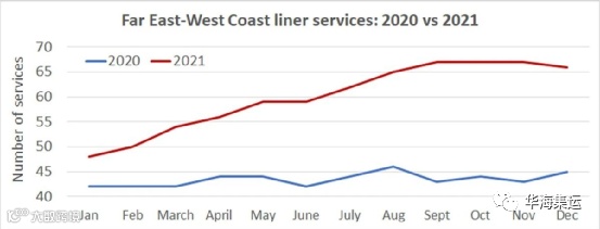据eeSea称,东亚-美西航线的服务数量从1月份的48条激增至本月的67条。相比之下,去年这条航线上的服务数量保持在稳定的42-46条。