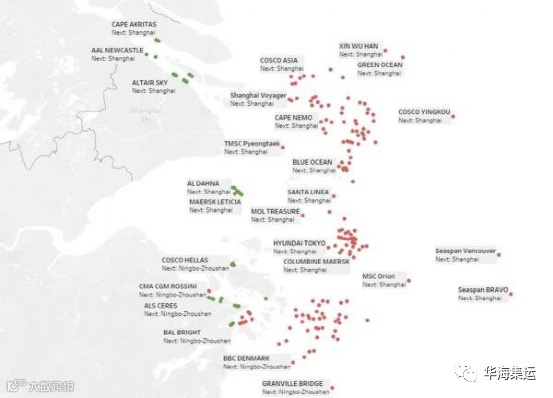 根据eeSea数据,在上海和宁波港外等待装运出口货物的船舶截止上周五达到154艘,是LA/LB的两倍多。最近几周,停泊在上海和宁波附近的集装箱船数量激增。目前,全国有242艘集装箱船等待泊位。