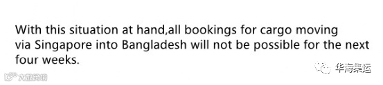 当前目的地为孟加拉吉大港的货物在新加坡的积压非常严重。在这种情况下,在接下来的四个星期内,所有通过新加坡运往孟加拉国的货物都将无法预订!