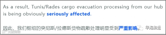 据悉,由于严重的运营延误,法国达飞日前已决定停止接受突尼斯和雷达斯港口的预订,“立即生效,直至另行通知”。