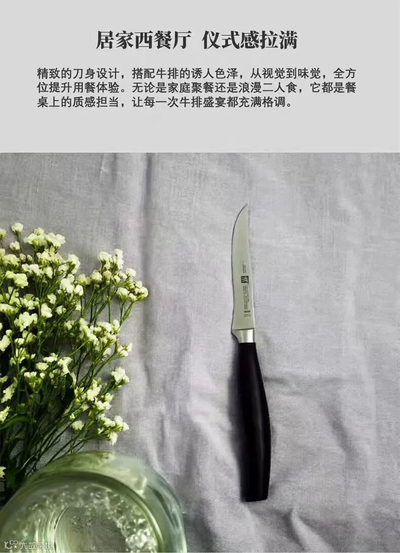 不止是工具,更是餐桌美学的延伸。双立人牛排刀将德系严谨工艺与现代设计相融,刀身线条利落流畅,握柄质感温润细腻。锋利持久不易钝,锯齿设计适配各类牛排肌理,无论是家庭聚餐的温馨时刻,还是二人世界的浪漫晚餐,都能以利落切割,为美味加分,让仪式感触手可及