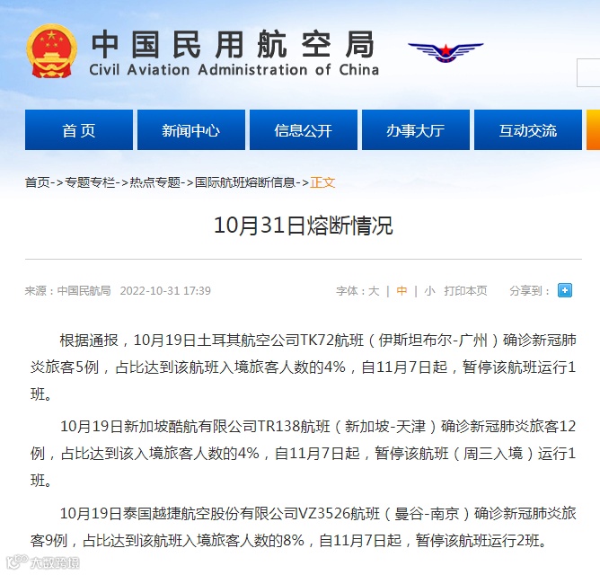 据中国民用航空局网站消息,根据通报,10月19日土耳其航空公司TK72航班(伊斯坦布尔-广州)确诊新冠肺炎旅客5例,占比达到该航班入境旅客人数的4%,自11月7日起,暂停该航班运行1班。
