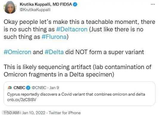 晚些时候,世卫组织卫生紧急项目技术负责人玛利亚·范凯尔克霍弗也针对这一问题在社交媒体发文,她同样认为,之所以会出现“德尔塔克戎”,很可能是实验室在测序过程中发生了污染,并呼吁不要再使用“德尔塔克戎”的叫法。