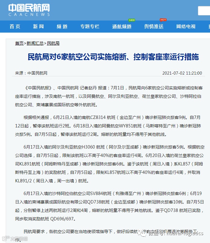 《中国民航报》、中国民航网 记者赵丹 报道:7月1日,民航局向6家航空公司实施熔断或控制客座率运行措施,涉及南航一航班,以及阿曼航空、阿尔及利亚航空、荷兰皇家航空公司、沙特阿拉伯航空公司、柬埔寨景成国际航空等外航航班。