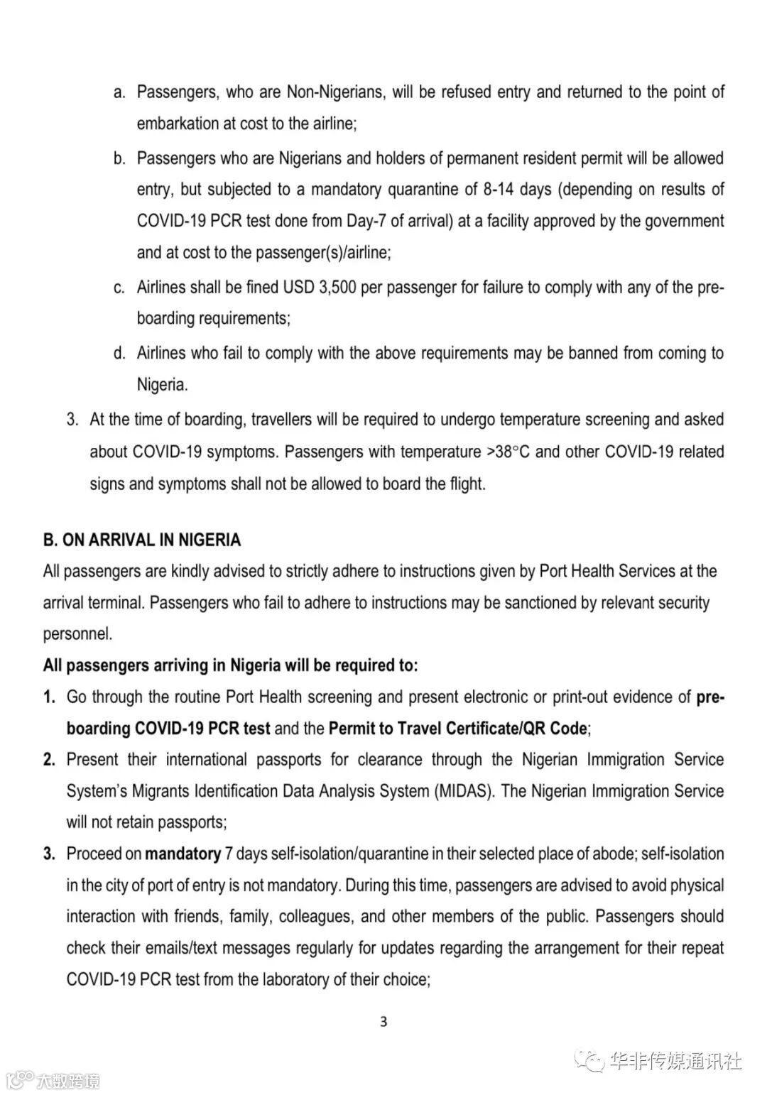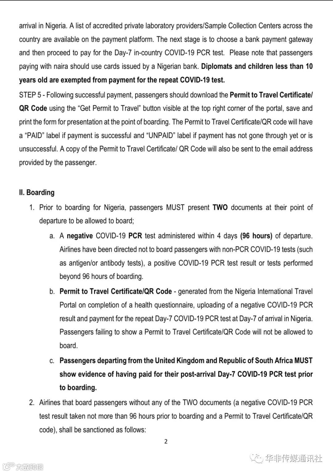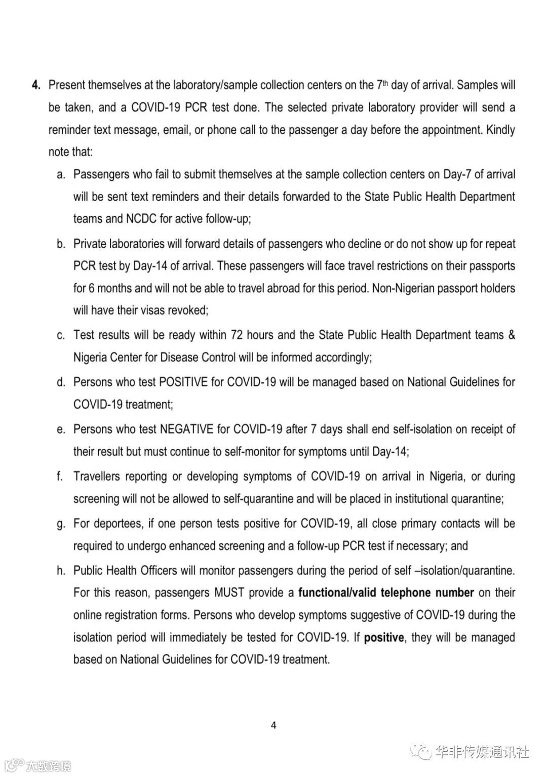 尼总统抗疫专班更新入境防疫规定,要求自1月11日起,所有计划进入尼日利亚的旅客必须在登机前4天(96小时)内接受核酸检测,检测有效期从样本采集之时算起;