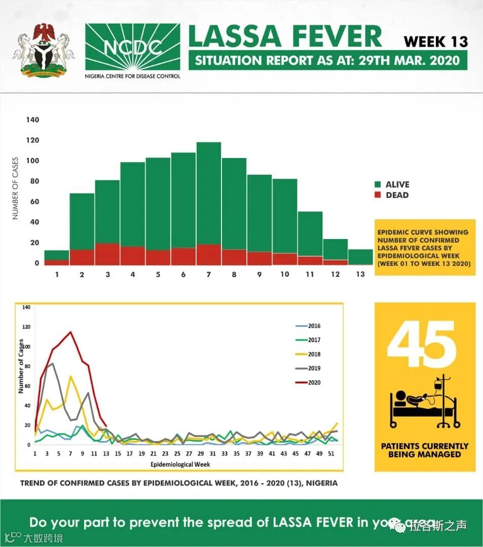 尼日利亚疾病控制中心(NCDC)公布,尼新增19例拉沙热确诊患者,其中翁多州6例,埃邦依州5例,埃多州3例,三角州、包奇州、科吉州、高原州和塔拉巴州各1例,截至发稿时刻,最新数据显示,202本次爆发以来尼日利亚共确诊951例,死亡185例。总体发病呈现下降趋势。
