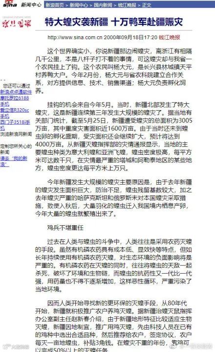 据钱江晚报报道,2000年5月,新疆北部发生了特大蝗灾,除采取化学药物外,由一群群牧鸡、牧鸭组成的“生物部队”也在新疆的“灭蝗大战”中大显身手。