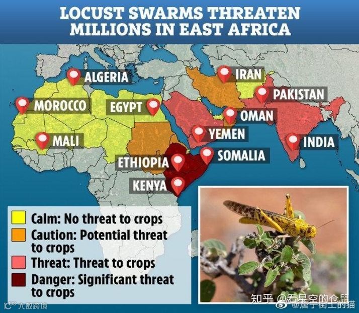 近日,联合国粮食及农业组织(FAO)向全球进行了预警,称希望全球高度戒备现在正在肆虐的蝗灾,防止被入侵国家出现粮食危机。据悉,本次蝗灾始于非洲,然后飞过红海进入欧洲和亚洲,目前已经到达了巴基斯坦和印度,距中国可以仅一步之遥。