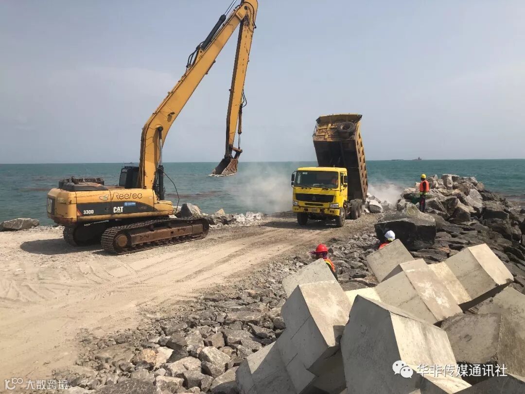 目前,项目现场营地已经建成,设计工作已经基本完成,防波修建了545米,主要施工设备也已调遣至项目现场,进驻主要管理人员近300人。