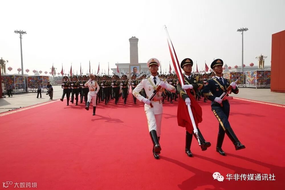 国旗护卫队从人民英雄纪念碑基座出发,走向旗杆基座。新华社记者 费茂华 摄