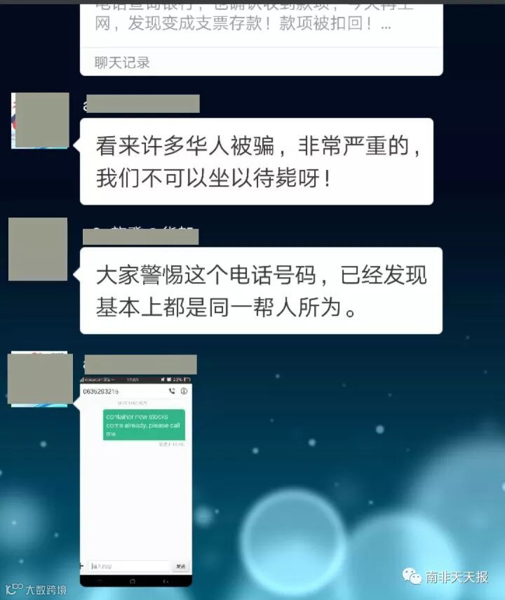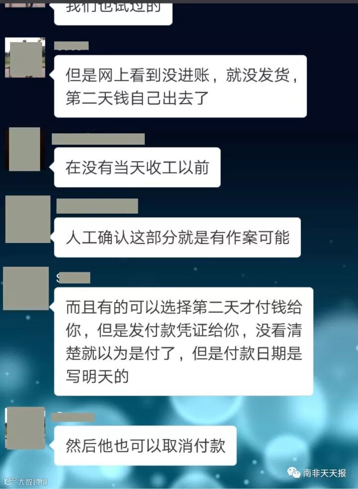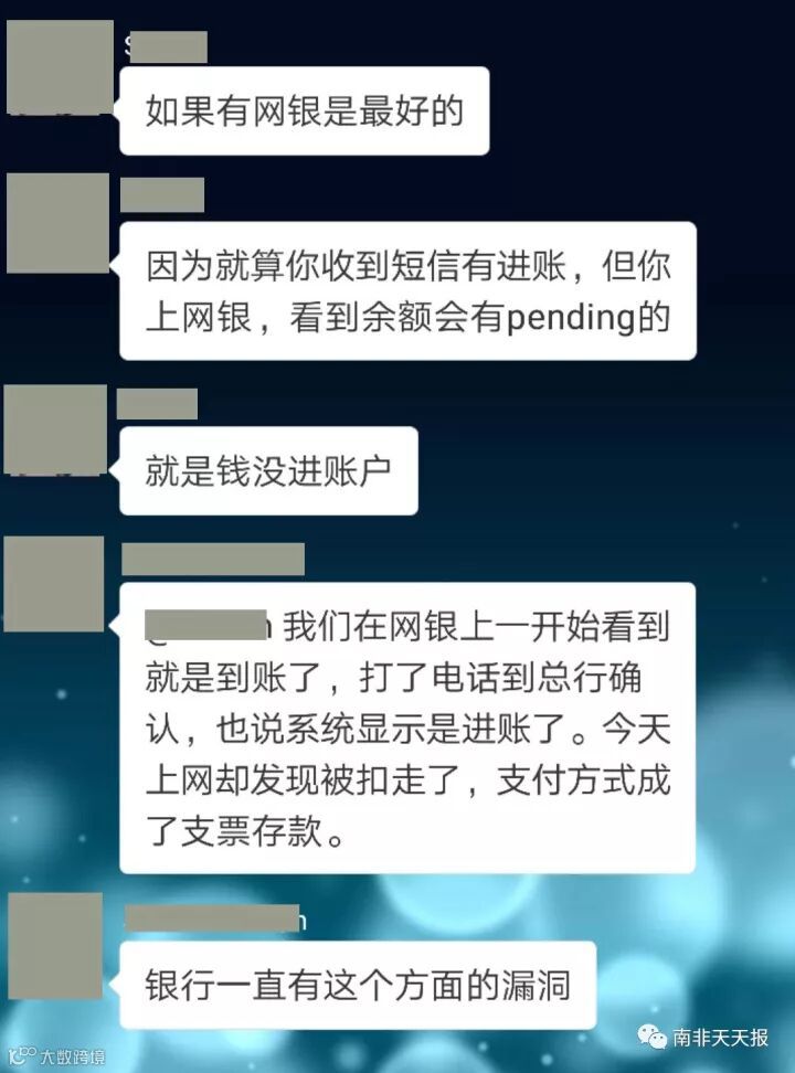 据南非华人圈网络微信群消息,大家在讨论最近被买货客户假银行转账欺诈的事情,提醒大家注意虚假银行转账和支票假转账的货款支付,近期已经有数名华商被骗。有华人侨胞介绍说,一定要非常注意支票转账或支票存款(cheque deposit或cheque transfer),这些都是可以随时撤销的支付行为,所以不要在看到短信提醒收到款项就马上给客户发货,一定要查看网上银行确认是现金存款还是支票存款,如果是支票方式支付的,一定要等待,并联系银行确认款项情况,即使自己账户已经显示支票存款到账,依旧要与银行确认款项情况。虽然有华人侨胞表示,银行有内鬼与骗子合伙干欺骗的事情,但是依旧要与银行确认,并尽量要求客户不要通过支票存款或支票转账方式支付。