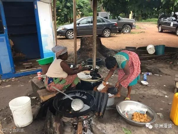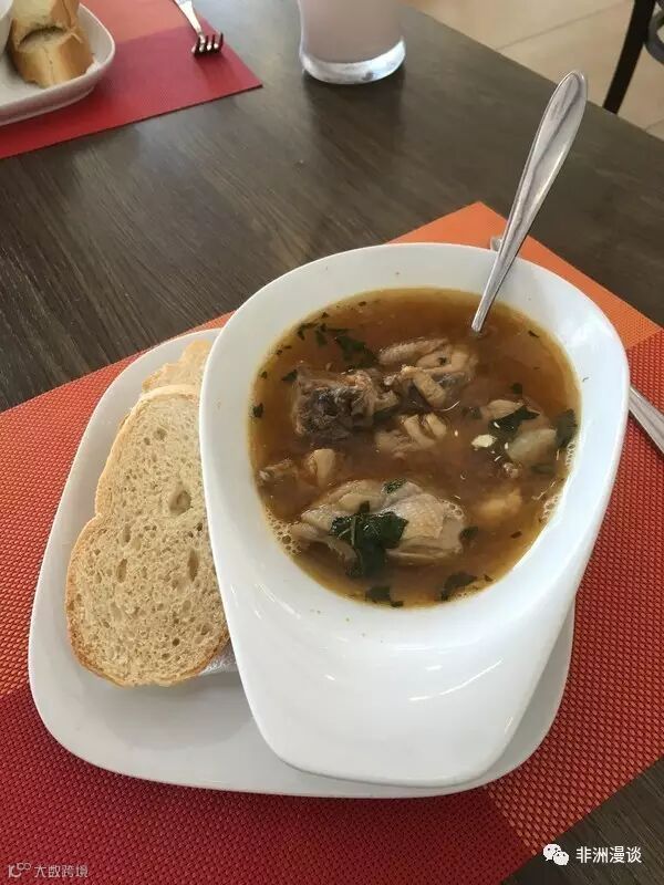 此图是尼日利亚人几乎每天都在吃的一种食物,名叫cassava,用手揪下面团沾着汤汁吃,汤汁里多半是有秋葵和鱼,味道微腥比较粘稠。此图是我在丽笙酒店自助吃的,看上去很干净,如果在大排档看到一般人是不敢尝试的。