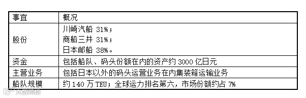 2016年10月31日上午,日本邮船、商船三井及川崎汽船(英文名称分别是NYK、MOL及Kline)三家航运公司官网分别发布“合并集装箱运输业务”的通知。通知表明,日本三家航运公司董事会决议,并经当局监管部门的批准,将成立一合资公司,开展包括日本以外的全球码头业务在内集装箱运输业务,并于10月31日上午签订整合业务的协议。