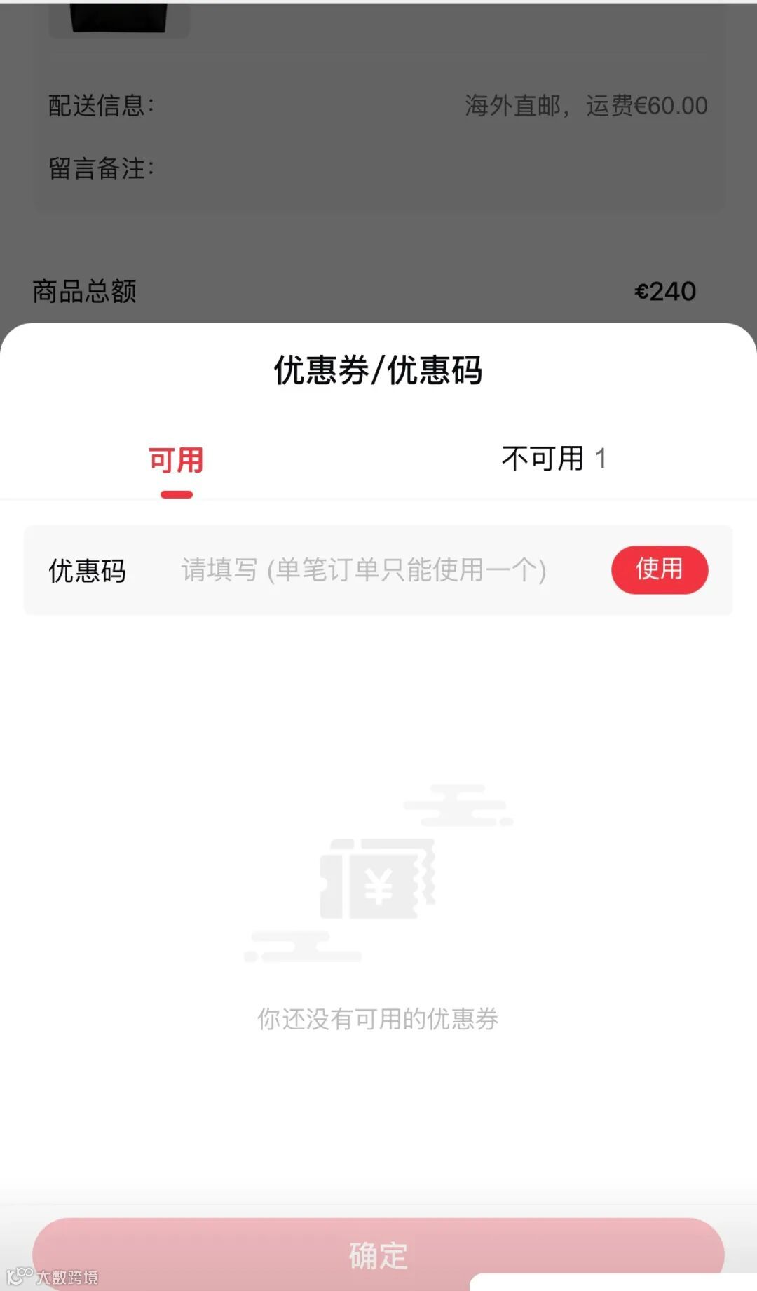 第二部: **寻找“优惠码”入口**:在结算页面仔细查找 **“优惠券/优惠码”** 的按钮或输入框(如下图)。