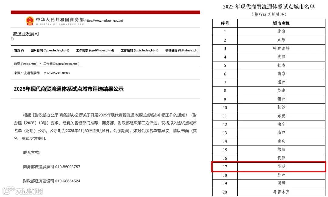 2025年5月30日,商务部公示2025年现代商贸流通体系试点城市名单,昆明凭借在商贸流通领域的优势经验成功入选。昆明作为中国面向南亚东南亚开放的重要门户,在现代商贸流通体系建设方面具有得天独厚的优势——面向南亚东南亚市场的辐射带动作用显著、物流立体网络完善、优势产业发展势头良好、回收网络健全。
