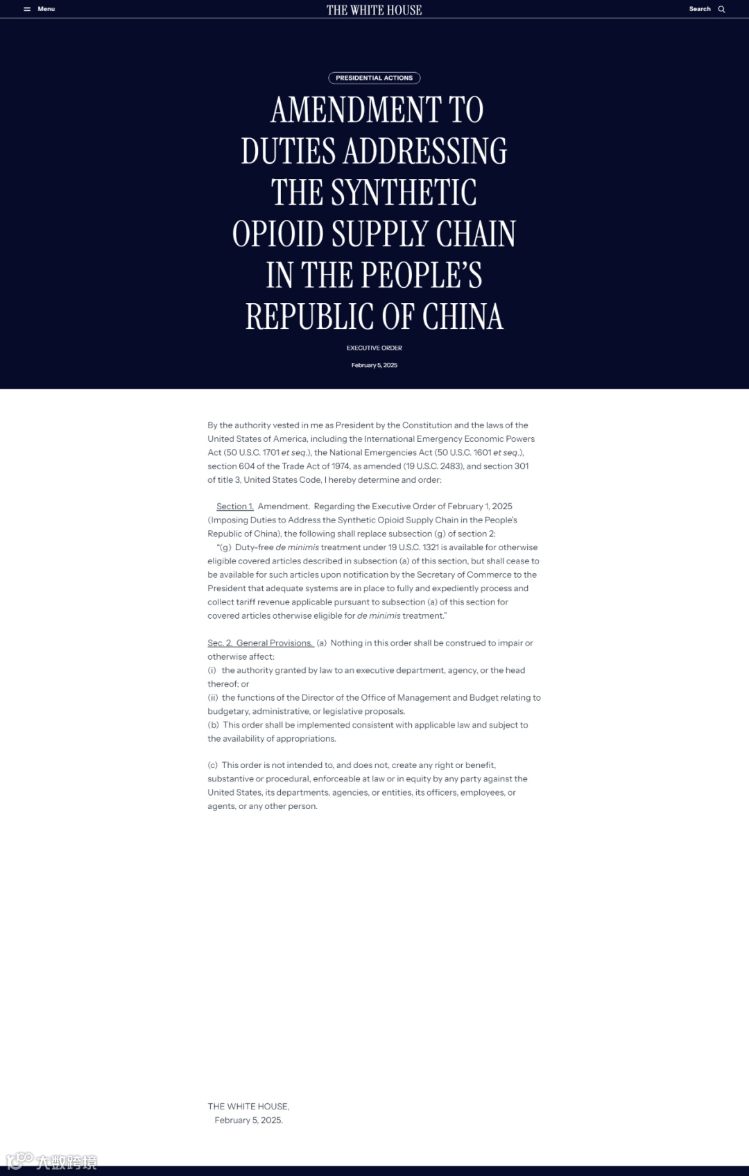 美国当地时间2月5日,白宫发布新的行政命令,对原2月1日生效的事关中国关税措施的行政命令进行修改。原命令暂停了中国出口到美国的价值低于 800 美元的包裹进入美国,而无需支付关税。新的行政命令暂时允许对中国包裹实行小额免税,直至美国商务部通知特朗普总统建立完善的系统措施后再做其他决定。