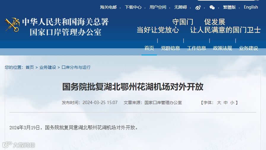 5月15日,中国民用航空局批复,同意“鄂州花湖机场”更名为“鄂州花湖国际机场”,是全国首个获批国际机场的专业货运枢纽机场。