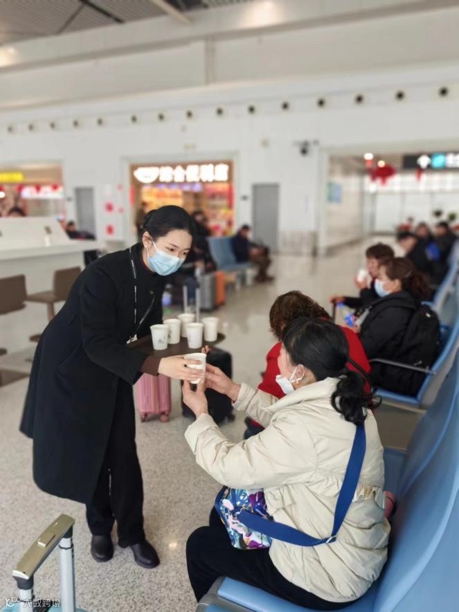 值机、问询、安检等岗位协同配合,安排志愿服务人员为旅客提供送姜汁可乐、红茶、红枣桂圆枸杞茶等,主动了解旅客需求,提供关心关爱服务。