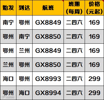 开航初期,为回馈广大旅客,利用新开通的航线,为通航城市提供更为便捷的交通条件,特投放特惠机票活动,鄂州出港最低仅需169元,方便大家出行高效快捷!