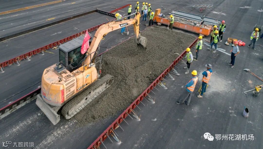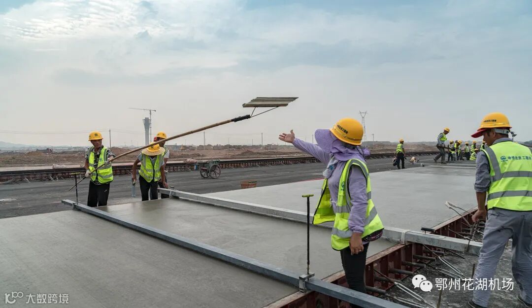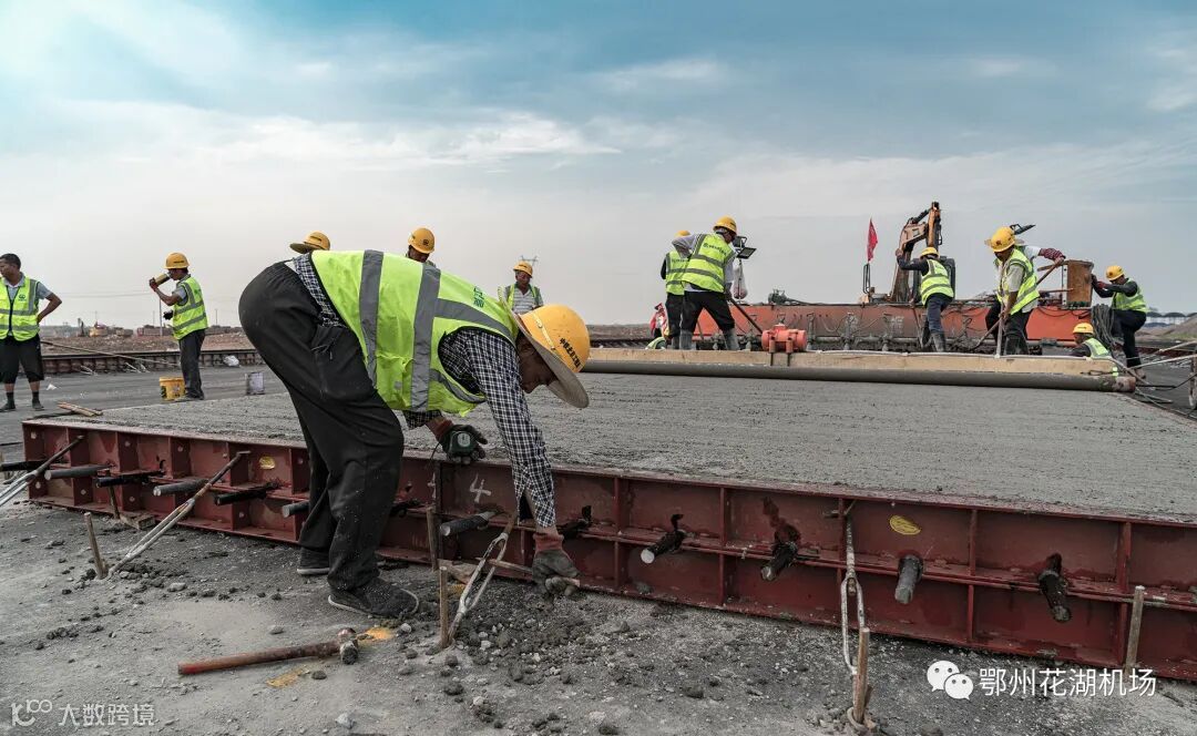 6月2日下午15时,在机械的轰鸣声中,鄂州花湖机场东跑道主体结构道面混凝土正式开始浇筑,机场飞行区工程东西两条跑道同步进入冲刺阶段。