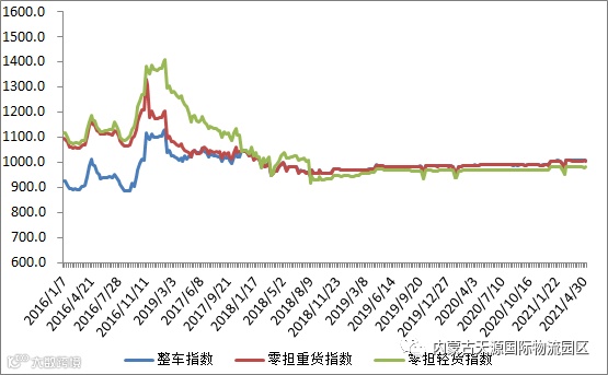 分车型看,各车型指数环比有所回升。其中,整车指数为1006.41点,比上周回升0.02%;零担轻货指数为981.46点,与上周基本持平;零担重货指数为1005.66点,比上周回升0.04%。