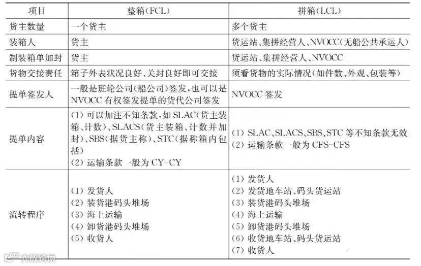海运整箱和海运拼箱,都具有提单的基本属性,如货物收据功能、运输契约的证明、属于物权凭证等。两者的区别如下。