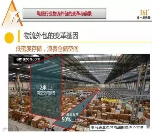 大家再来看一下这张图,也是我们这位朋友提供的。这张图给到我们什么样的东西呢?大家看到了亚马逊的配中心,这两个影印的部分空间浪费很大,通道的浪费很大。所以这样的仓储在我们中国可以说到目前为止还是比比皆是。