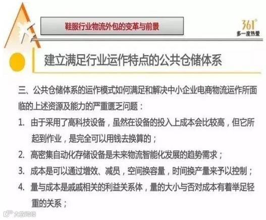 所以第一,他的受众群必须是定向性的行业,比方是服装的,或者是食品的,比方说是冷链的,你这个受众群明确了,那么他的共性就会放大。第二,你投入的设备必须是智能灵活、协同共享与准确高效的。因为你这些设备投进去你的柔度就会很多,你的适应性就会非常高,这样才可以充分的满足物流体系的智能的自动化。另外我们还需要在后续的运营过程中不断的优化和提升我们的整个的运营。第三个必须具备的条件就是你要满足广大中小型电商企业的运营企业,像我们这种大的品牌公司我们的电商还是这么一种状态,那么小型的品牌公司的物流资源需求我想对我们肯定是更渴望。所以你要满足他的这种情况,去解决他们的资源需求。