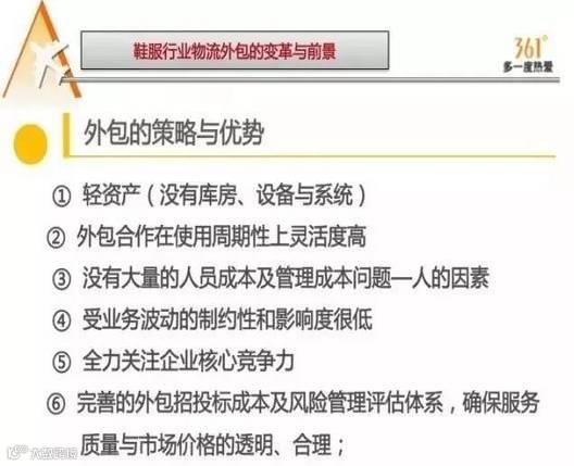 第五,可以让企业全力去关注他的核心竞争力,就像赵总他们一样。其实鞋服行业的老大阿迪、耐克他们的物流设施跟国内是不一样的。他的生产是外包的,物流也是外包的,只是耐克前两年才在亚洲这边搞了自己的物流中心,早期他其实都没有的。他的关键就两个点,第一个是产品的研发,第二个就是他的销售。所以核心竞争力非常的重要。