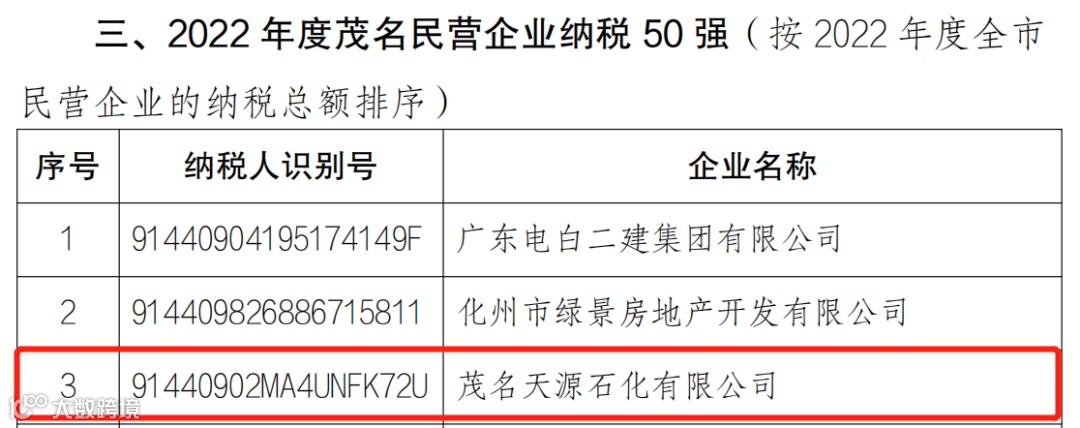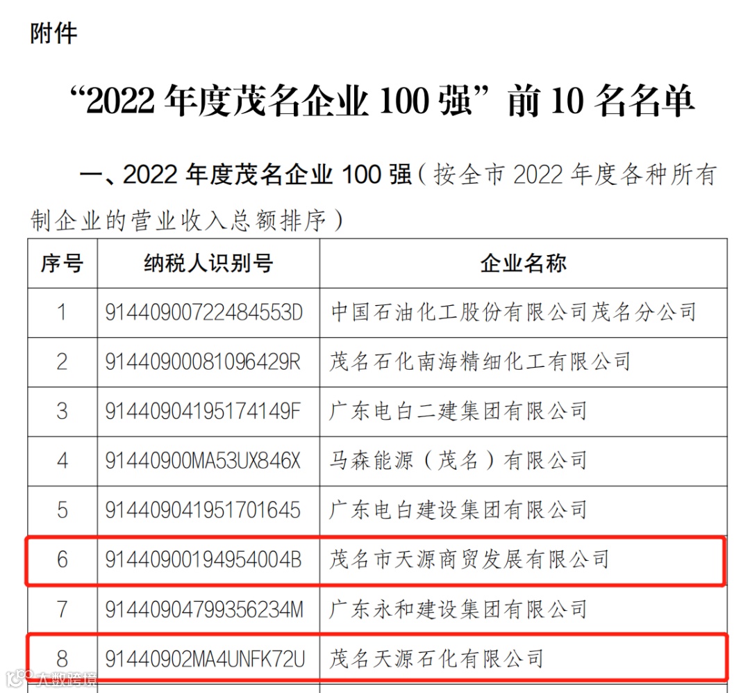 2023年4月18日,茂名市企业联合会通报了 “2022年度茂名企业100 强” 名单。茂名市天源商贸发展有限公司入围 “2022年度茂名企业100 强”、“2022年度茂名服务业企业 50 强”;茂名天源石化有限公司入围 “2022年度茂名企业100 强”、“2022年度茂名制造业企业 50 强” 及 “2022年度茂名民营企业纳税 50 强”!