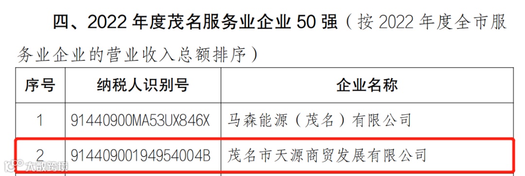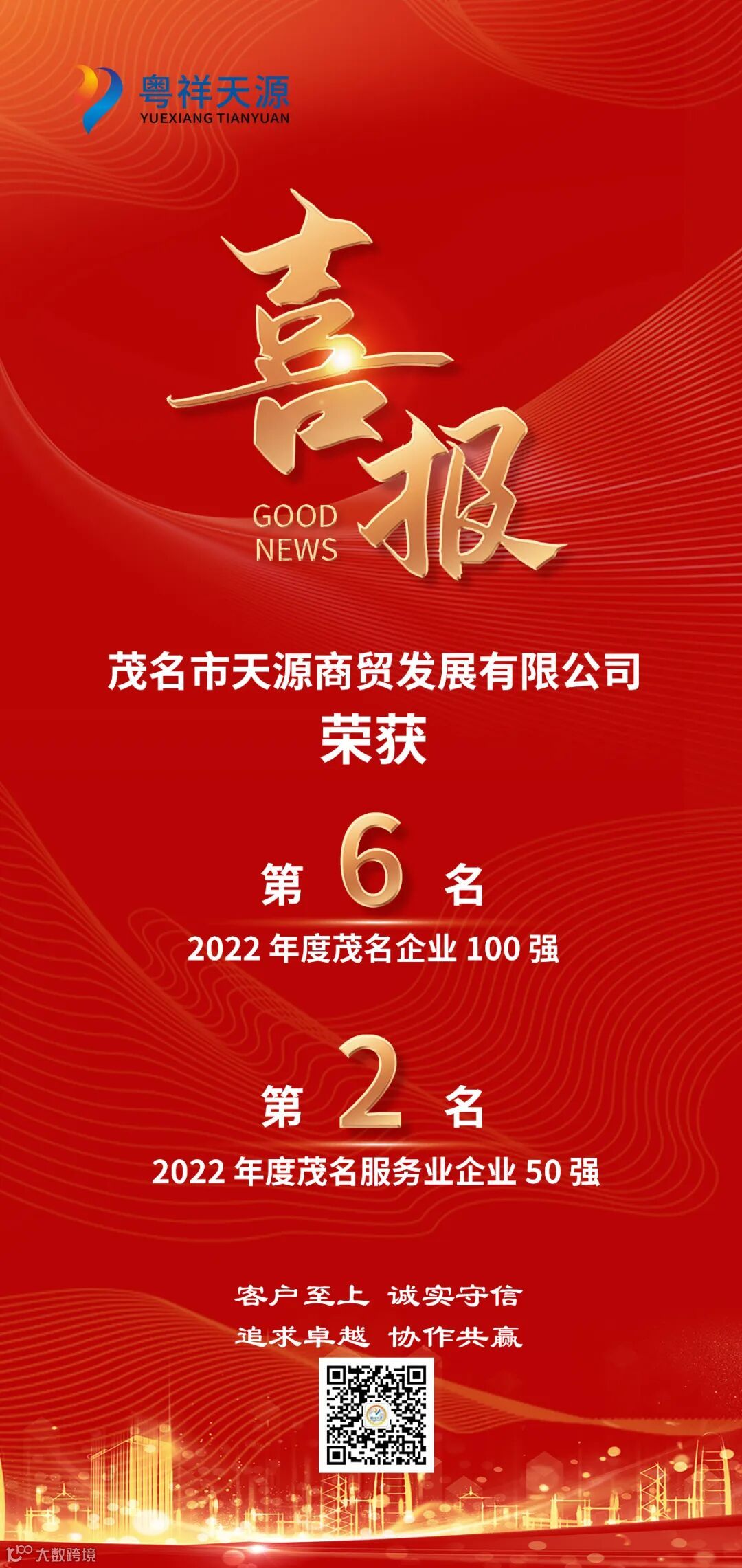 粤祥天源2023年4月18日,茂名市企业联合会通报了 “2022年度茂名企业100 强” 名单。茂名市天源商贸发展有限公司入围 “2022年度茂名企业100 强”、“2022年度茂名服务业企业 50 强”;茂名天源石化有限公司入围 “2022年度茂名企业100 强”、“2022年度茂名制造业企业 50 强” 及 “2022年度茂名民营企业纳税 50 强”!