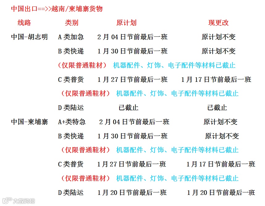 您好!非常感谢贵公司长期以来对我司工作的支持与配合!十分抱歉的通知您,由于接近年关加之疫情多地复发,中越边境海关将于1月18日结束年前工作并对口岸实行封关,现我司再此调整部分线路截止时间,具体调整方案如下: