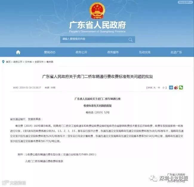 人民网广州3月19日电(吕绍刚、胡苇杭) 3月18日,广东省人民政府网站在政务公开栏发出文件《广东省人民政府关于虎门二桥车辆通行费收费标准有关问题的批复》。根据批复及附件内容,7座以下客车(含7座)以及2吨以下的货车,走完虎门二桥全程收费42元。