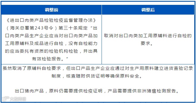 取消出口生产企业对肉类和水产品加工用原辅料进行自检的监管要求。