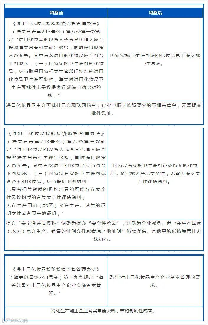 公告中涉及食品化妆品的7个“取消”、1个“免于”,均是对相关产品管理办法规定内容进行重要变革,是海关继续落实“放管服”改革的举措。相关内容调整后,进一步压紧压实相关企业主体责任,有效削减制度性交易成本,为支持企业开拓贸易市场提供契机。