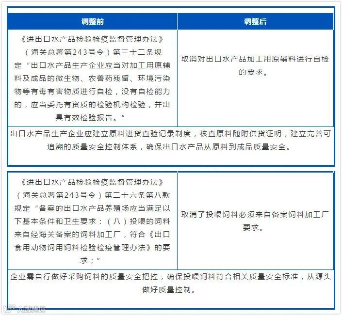 取消对出口水产品养殖场投喂的饲料来自经海关备案的饲料加工厂的监管要求。