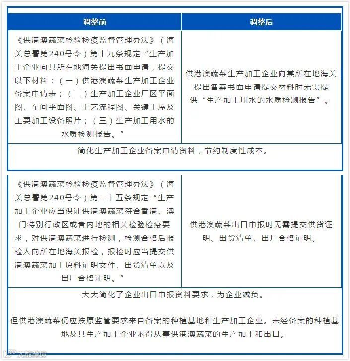 取消对供港澳蔬菜生产加工企业备案时向所在地海关提交生产加工用水的水质检测报告的监管要求。