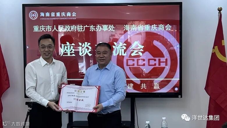 导读:2023年12月12日上午11点20分,重庆市人民政府驻广东办事处与海南省重庆商会交流座谈会在海南省重庆商会会议室召开。会上,海南省重庆商会聘请重庆洋世达集团杨勇董事长担任海南省重庆商会荣誉会长。