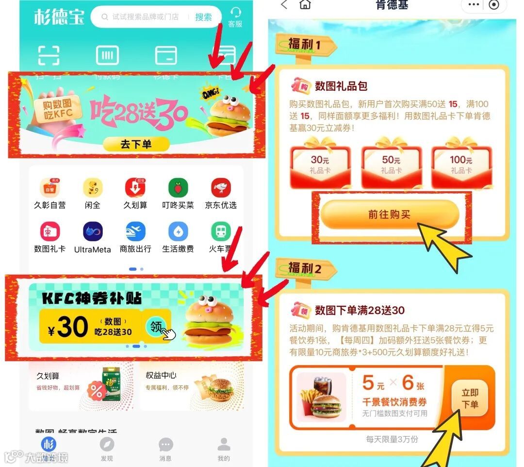 新用户在「杉德宝」购买50元数图礼品包,即可额外获赠15元KFC餐饮消费券~