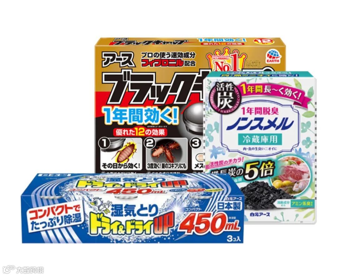套装包含日本热销三合一除湿剂,全屋适用,去除家中潮湿空气和预防霉菌;冰箱除味剂,冷藏区适用,使用天然炭材料,除湿除臭;杀蟑饵剂,含0.05%氟虫氰成分,一只取食,全窝灭杀。