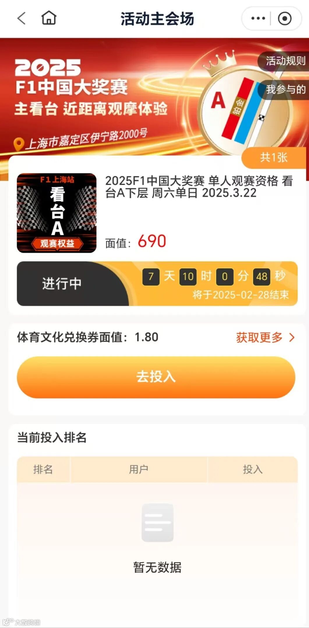 在排名活动页,用户可以根据自己的需要选择相应的活动场次,直接投入相应面值的体育文化兑换券,参与排名赢F1观赛资格。