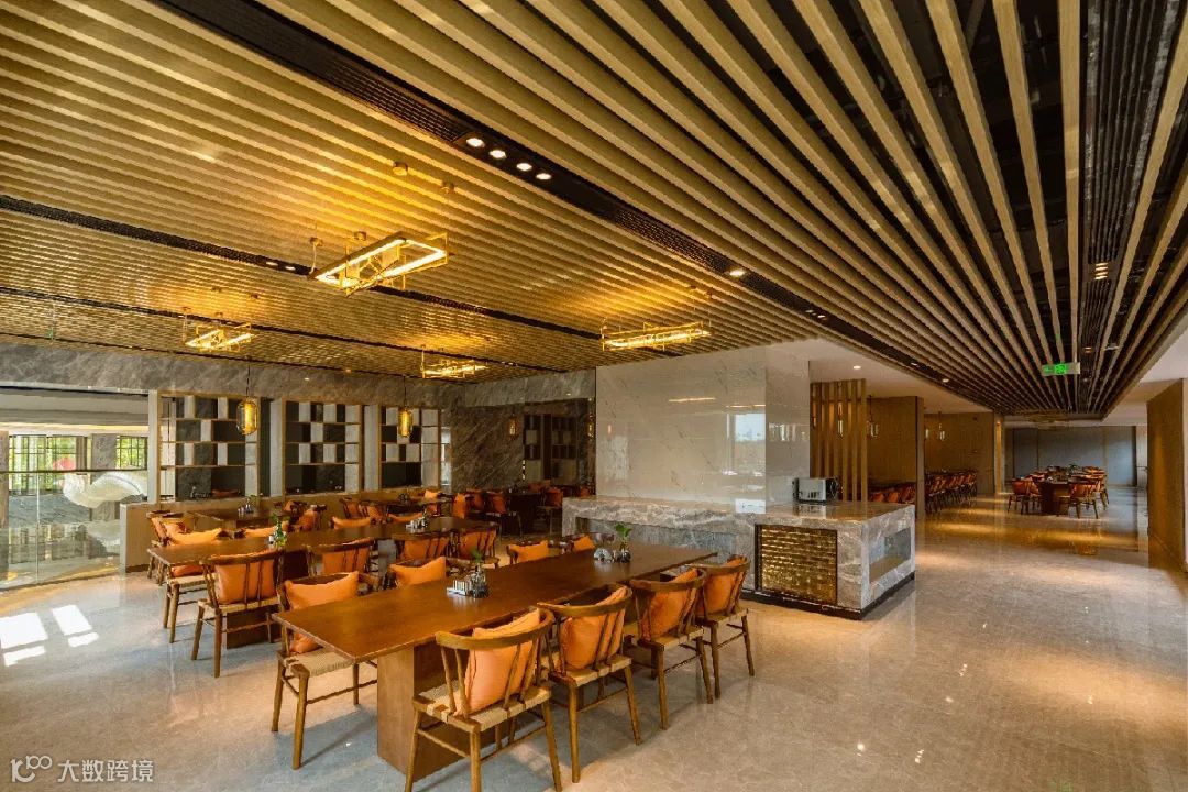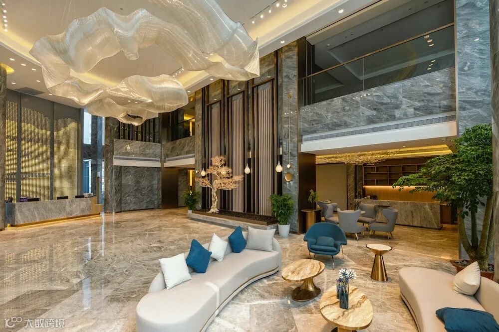 步入酒店大堂,便被江南水波元素的吊灯吸引了目光,金光映在大理石的地板上,搭配江南园林小景,瞬间梦回千年前的杭城。