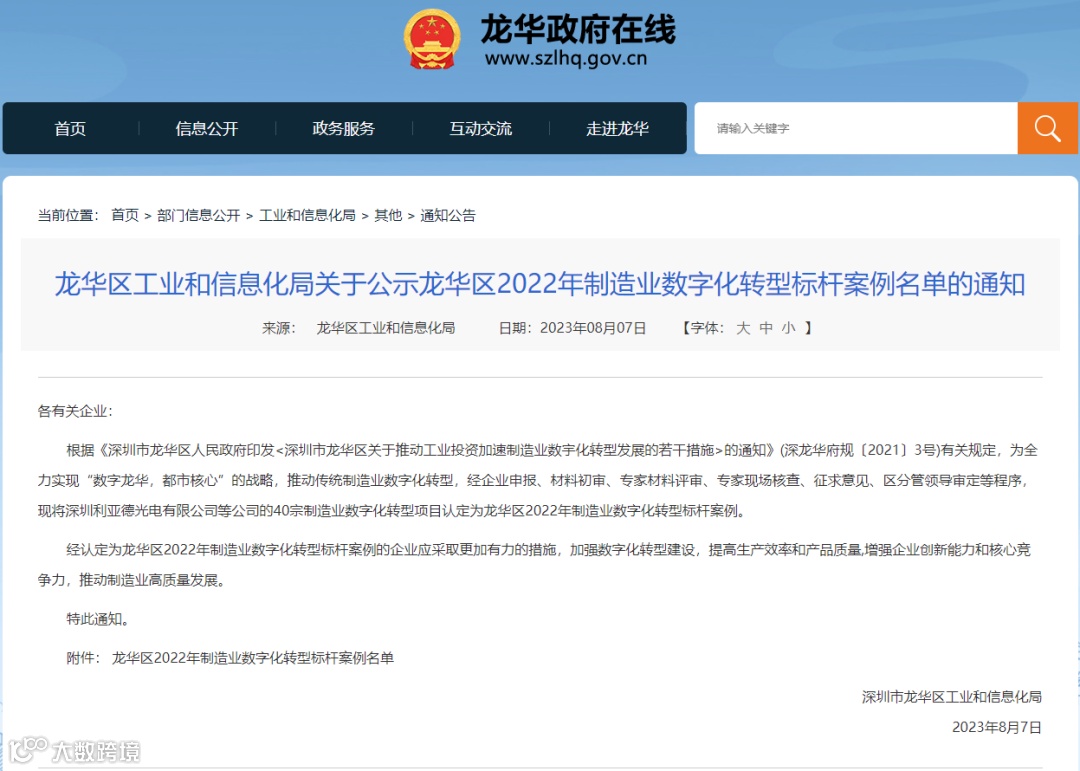 根据《深圳市龙华区人民政府印发<深圳市龙华区关于推动工业投资加速制造业数宇化转型发展的若干措施>的通知》(深龙华府规〔2021〕3号)有关规定,为全力实现“数字龙华,都市核心”的战略,推动传统制造业数字化转型,经专家材料评审、专家现场核查等程序层层筛选,深圳市杰美特科技股份有限公司的“基于工业互联网的模具生产中心数字化提升项目”被深圳龙华区工信局认定为2022年制造业数字化转型标杆案例。